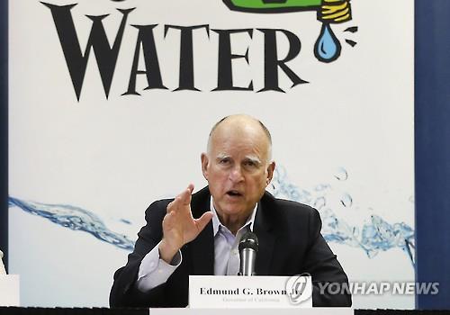 △ (AP=연합뉴스) 제리 브라운 캘리포니아 주지사가 지난달 16일 열린 가뭄대책 회의 후 기자회견을 하고 있다.