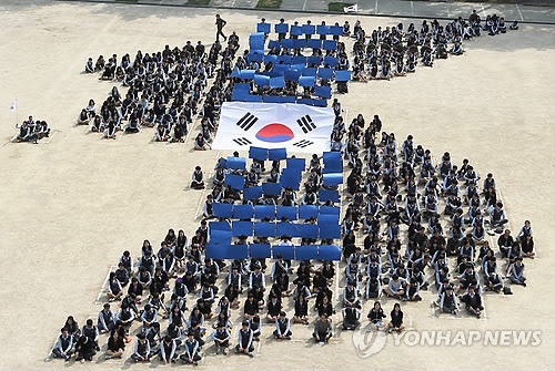 △ 운동장에 펼쳐진 한반도 (서울=연합뉴스) 박정헌 기자 = 7일 오전 서울 강북구 화계중학교에서 학생들이 한반도 형상 안에 '통일' 두 글자를 만드는 플래시몹을 하고 있다. 2015.5.7 home1223@yna.co.kr