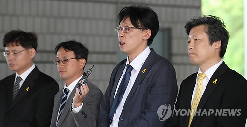 △ 기자회견하는 MBC 노조원들 (서울=연합뉴스) 이승민 기자 = 2012년 공정방송 요구파업 당시 업무방해 등의 혐의로 기소된 정영하 전 MBC 노조위원장을 비롯한 노조원들이 7일 오후 서울 서초구 서울고등법원에서 열린 2심에서 무죄를 선고 받은 뒤 기자회견을 하고 있다.