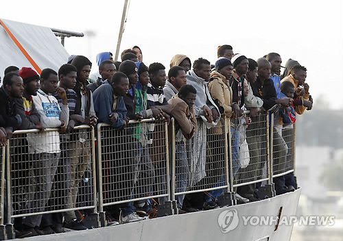 △ (시칠리아 AP=연합뉴스) 아프리카 이주자들이 6일(현지시간) 이탈리아 시칠리아 메시나 항의 아이슬란드 경비함정에서 하선 대기하고 있다. 지난 주말 등 3일간 리비아에서 지중해로 고무보트와 어선에 실어보낸 난민 가운데 약 7천명이 구조됐다고 해안경비 당국이 보고했다.