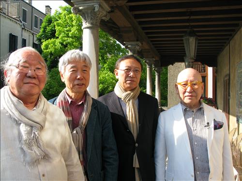| △ 작가 하종현(왼쪽부터), 이우환, 전시를 기획한 이용우, 작가 박서보가 단색화전이 열리는 베네치아 건물에서 사진을 촬영하고 있다. |