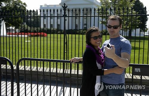 | △ 지난해 9월 잇단 무단 침입 사건 이후 백악관 울타리에 추가로 설치된 자전거 거치대 앞에서 사진을 찍는 관광객들. (epa=연합뉴스) |