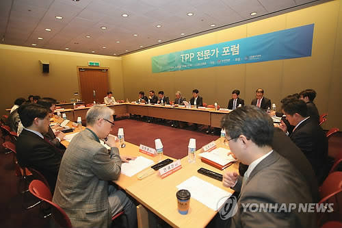 | △ (서울=연합뉴스) 8일 서울 강남구 삼성동 코엑스에서 한국무역협회 국제무역연구원 주최로 열린 'TPP 전문가 포럼'에서 관련 분야 전문가들이 의견을 나누고 있다. 2015.5.8 << 한국무역협회 제공 >> photo@yna.co.kr |