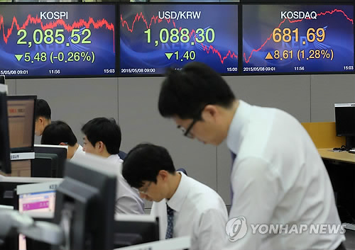 | △ 코스피 내리고 코스닥은 오르고 (서울=연합뉴스) 최재구 기자 = 8일 서울 명동 외환은행 딜링룸에서 직원들이 경제지표를 모니터하고 있다. 이 날 코스피는 2,085.52로 코스닥은 681.69를 기록하며 장을 마쳤다. |