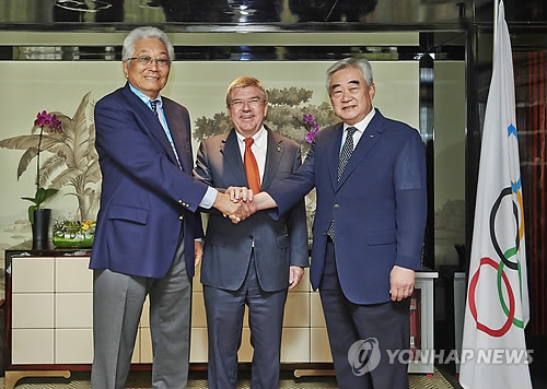 | △ 조정원 세계태권도연맹(WTF) 총재(오른쪽)와 장웅 국제태권도연맹(ITF) 총재가 지난해 8월 제2회 유스올림픽이 열린 중국 난징에서 토마스 바흐 국제올림픽위원회(IOC) 위원장이 지켜보는 가운데 태권도 발전을 위한 의향서에 서명한 뒤 악수하는 모습. <세계태권도연맹 제공> |