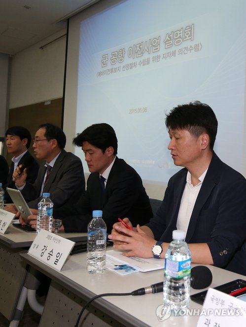 | △ 군(軍) 공항 이전사업 설명회 (수원=연합뉴스) 신영근 기자 = 8일 오후 경기도 수원시 영통구 경기도중소기업종합지원센터에서 수원 공군비행장 이전 타당성 평가를 앞두고 경기지역 지방자치단체를 대상으로 군 공항 이전사업의 절차와 예비 이전 후보지 선정절차 수립을 위한 설명회가 열리고 있다. 2015.5.8 drops@yna.co.kr |