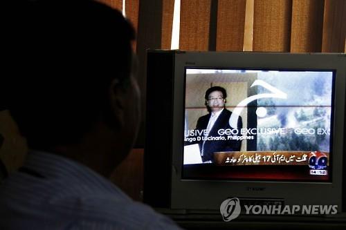 △ 8일 파키스탄에서 한 남성이 외국 대사 등 7명이 숨진 헬기 추락사고 보도를 지켜보고 있다.(EPA=연합뉴스)
