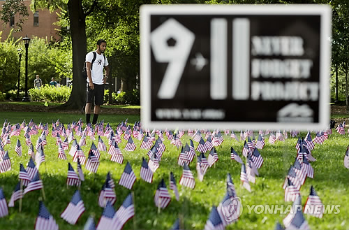 △ 미국 테러 전문가가 '이슬람국가'(IS)가 수년 내에 미 본토를 겨냥해 '9·11 테러'에 버금가는 대규모 테러를 자행할 수도 있다고 지적했다. 사진은 9·11테러 13주년인 지난해 9월, '그날의 희생자들'을 상징하는 소형 성조기들이 꽂혀 있는 미국 조지아공대 교정. Geoving Gerard, 20, of Atlanta, looks over some 3,000 flags representing each life lost in the Sept. 11, 2001 attacks as they stand on display to commemorate the 13 anniversary of the attacks, at Georgia Tech University, Thursday, Sept. 11, 2014, in Atlanta. (AP Photo/David Goldman)