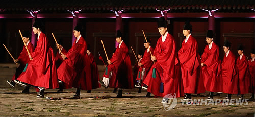 | △ 지난 8일 오후 서울 종로구 종묘에서 제1회 궁중문화축전 행사의 일환인 '종묘제례악 야간 공연'이 열리고 있다. |