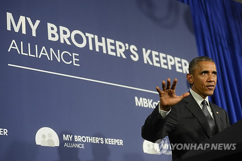 △ (뉴욕 AP/더 데일리 뉴스=연합뉴스) 볼티모어 흑인청년 사망에 따른 폭동사태로 흑인 젊은이들의 열악한 교육과 빈곤에 대한 미국사회의 관심이 재부각된 가운데 버락 오바마 대통령이 '내 형제의 보호자'(My Brother's Keeper) 프로그램 강화계획을 4일(현지시간) 발표했다. '내 형제의 보호자'라는 명칭은 구약 창세기 4장의 8∼9절에서 카인이 질투심에 동생 아벨을 죽이고 하나님에게 '내가 내 아우를 지키는 자이니까?'(Am I My Brother's Keeper?) 라고 말한 구절 중에서 역설적으로 따온 것. 사진은 이날 오바마 대통령이 뉴욕주 리먼컬리지의 독립적 비영리단체 '내 형제의 보호자 연합' 창설 행사에서 연설하는 모습.