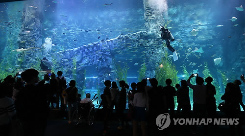 △ 10일 오후 서울 송파구 잠실동 제2롯데월드 아쿠아리움을 찾은 시민들이 아쿠아리움을 둘러보고 있다. 제2롯데월드 운영사인 롯데물산은 12일께로 예정된 아쿠아리움(수족관)·시네마(영화관) 재개장에 앞서 사흘간 지역주민과 시민 3만6천여명을 초청해 무료 관람 행사를 진행하고 있다.