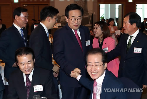 | △ 악수하는 서병수 홍준표 (부산=연합뉴스) 조정호 기자 = '성완종 리스트'에 연루돼 검찰 조사를 받은 홍준표 경남도지사가 11일 부산시 해운대구 벡스코에서 열린 KNN 창사 20주년 기념 포럼에 참석, 서병수 부산시장과 악수하고 있다. ccho@yna.co.kr |