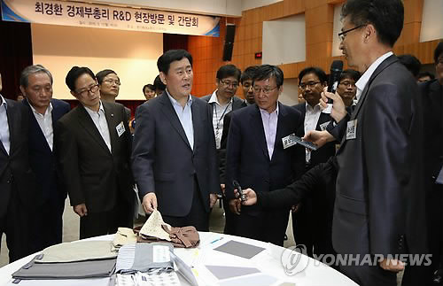 | △ 산학연 협력 R&D 현장 방문한 최경환 경제부총리 (안산=연합뉴스) 김주성 기자 = 최경환 경제부총리 겸 기획재정부 장관이 11일 오후 안산사이언스밸리 내 경기테크노파크를 방문, 중소기업 및 연구소 관계자들과 간담회를 가진 뒤 한 산학연 R&D 업체의 전자파 차단 소재에 대한 설명을 듣고 있다. |