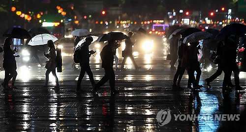| △ 서울, 태풍 노을 간접영향 (서울=연합뉴스) 신준희 기자 = 11일 늦은 오후 서울 광화문 앞에 우산을 쓴 시민들이 걸어가고 있다. |