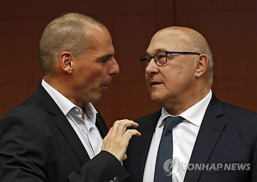 | △ (브뤼셀 EPA=연합뉴스) 야니스 바루파키스 그리스 재무장관(왼쪽)과 미셸 사팽 프랑스 재무장관이 11일(현지시간) 벨기에 브뤼셀의 유로그룹(유로존 재무장관 협의체) 회의에서 대화하고 있다. 유로존 재무장관들은 그리스에 대한 구제금융 분할금 지급을 위해 구조개혁을 점검하고 단기 유동성 지원 방안을 논의했다. 그리스의 채무불이행(디폴트) 여부에 관심이 모아진 가운데 그리스 정부는 이날 IMF(국제통화기금) 채무 7억5천만 유로를 상환했다고 발표했다. |