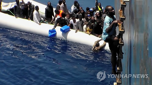 | △ '삶'과 '죽음'의 경계에서… (시칠리아 AP=연합뉴스) 3일(현지시간) 이탈리아 시칠리아 인근 해역에서 지중해를 건너던 난민들이 탄 고무 보트가 점차 가라앉고 있는 가운데 생존자가 밧줄 사다리를 통해 옆 화물선으로 올라가고 있다. 사진은 이 화물선의 선원이 찍은 것으로 5일 공개됐다. 구조된 이들은 시칠리아 동쪽 카타니아 항에 도착했으며 이 화물선에는 5구의 난민 시신도 있었다. 2010596@yna.co.kr |