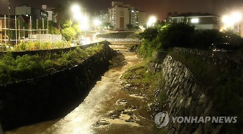 | △ (제주=연합뉴스) 김승범 기자 = 11일 제주지역에 강풍을 동반한 많은 비가 내려 한라산에 최고 420㎜ 넘는 비가 내린 가운데 평소 마른 하천이던 제주시 아라동 산지천 중류에 한라산에서 내린 빗물이 모여 흐르고 있다. 2015.5.11 bjc@yna.co.kr |