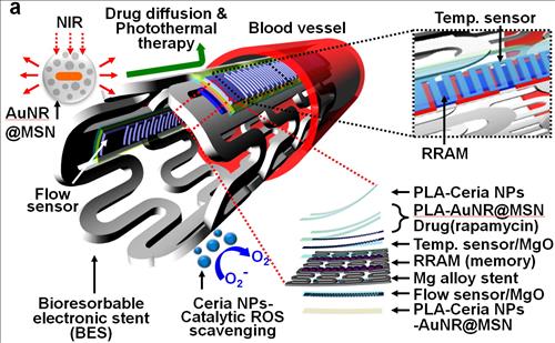 | △ 몸 안에서 분해돼 흡수되는 생체흡수성 전자 스텐트. 스텐트 그물망을 몸 안에서 분해돼 흡수되는 마그네슘합금으로 만들고 관 안쪽 면과 바깥면에 각각 생체에 해가 없는 물질(마그네슘-산화마그네슘-산화아연)로 혈류를 측정하는 센서와 온도를 측정하는 센서를 구현했다. 또 그물망 표면을 생분해성 고분자(PLA)로 코팅하고 이 고분자 안에 혈액응고나 염증을 방지하는 약물이 든 금(Au) 나노입자와 산화세륨(Ceria) 나노입자를 넣어 약물이 수개월에 걸쳐 방출되도록 했다. |