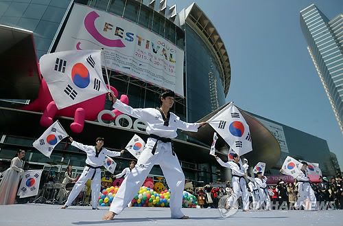 | △ 'C-페스티벌 2015 개막 축하' (서울=연합뉴스) 홍기원 기자 = 30일 오전 서울 강남구 삼성동 코엑스 정문에서 아시아의 비즈니스 중심지로 육성하기 위한 문화 축제인 'C-페스티벌 2015' 개막식이 열려 축하공연을 하고 있다. 이 행사는 다음달 10일까지 무역센터와 코엑스에서 열린다. 2015.4.30 xanadu@yna.co.kr |
