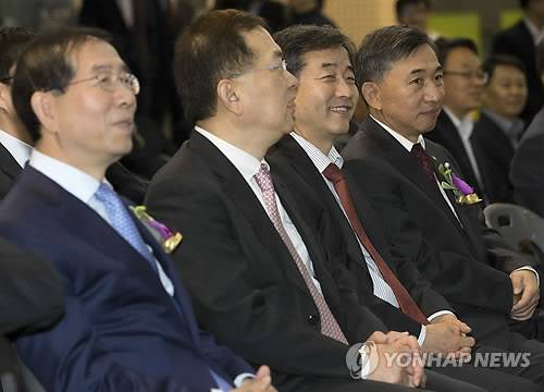△ 발언 듣는 엑스포 참석자들 (서울=연합뉴스) 윤동진 기자 = 박원순 서울시장(왼쪽)과 박노황 연합뉴스 사장(왼쪽 세번째) 등 참석자들이 12일 오전 서울광장 시민청에서 열린 2015 신문.뉴미디어 엑스포 개막식에서 사회자의 발언을 듣고 있다. 15일까지 4일간 열리는 이 박람회는 연합뉴스, 조선일보, 중앙일보, 한겨레 등 전국 주요 언론사들이 참여해 홍보 부스를 설치하고 자사 지면의 특징과 발전방향 등을 소개한다. 2015.5.12 mon@yna.co.kr