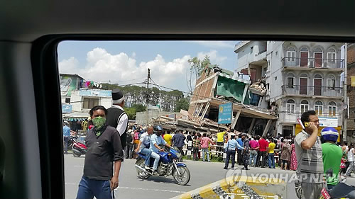 | △ 네팔 추가지진에 무너진 건물 (뉴델리=연합뉴스) 나확진 특파원 = 12일(현지시간) 네팔 카트만두 인근 박타푸르 지역에서 이날 발생한 규모 7.4의 지진으로 무너진 건물 주변에 주민들이 모여 있다. (주네팔 한국대사관 제공) |