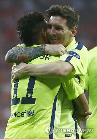 △ 득점에 성공한 네이마르를 축하하는 리오넬 메시(오른쪽).(AP=연합뉴스)
