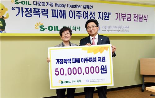 (서울=연합뉴스) 박대한 기자 = 에쓰오일(S-OIL)은 '에쓰오일 다문화가정 해피투게더 캠페인'의 일환으로 가정폭력 피해 이주여성들을 돕기 위한 후원금 5천만원을 한국이주여성인권센터에 전달했다고 13일 밝혔다.
