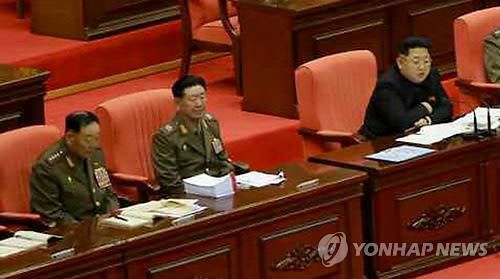 | △ 눈감은 현영철 북한 인민무력부장 (서울=연합뉴스) 북한 현영철 인민무력부장이 불경죄로 총살됐다고 13일 국정원이 밝혔다. 국회 김광림 정보위원장과 여야 정보위 간사들은 13일 오전 국회에서 이 같은 내용에 대해 취재진에게 브리핑을 했다. 사진은 2015 4월 24일과 25일 인민군 훈련일꾼 대회에서 눈을 감은 채 고개를 숙이고 있는 현영철 인민무력부장(왼쪽 첫번째)과 황병서 군 총정치국장(가운데), 김정은 국방위 제1위원장(오른쪽)의 모습. |