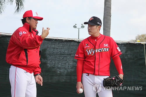 | △ 여건욱 지도하는 김상진 코치 (서울=연합뉴스) 미국 플로리다에서 새 시즌을 준비중인 프로야구 SK 와이번스 여건욱이 김상진 코치의 지도를 받고 있다. 2015.1.25 << SK 와이번스 제공 >> photo@yna.co.kr |