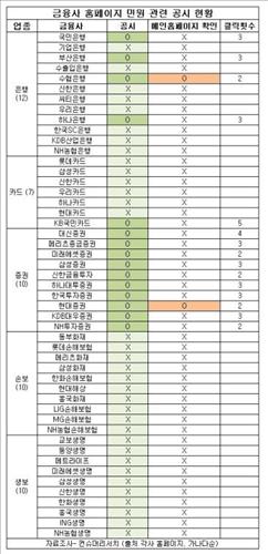 지난 2012년 11월 금융감독원이 소비자의 '알 권리' 차원에서 금융회사들에 "민원접수 처리 건수와 처리 결과, 진행사항 등을 홈페이지에서 쉽게 찾을 수 있도록 공시하라"며 가이드라인(지침)을 제시했으나 무려 70%의 금융사가 2년 넘게 이를 무시하고 있는 셈이다.