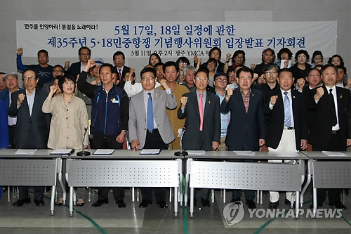 | △ 5·18 민중항쟁 35주년 기념행사위원회가 지난 11일 광주YMCA에서 열린 기자회견에서 님을 위한 행진곡을 제창하고 있다.(연합뉴스 자료사진) |