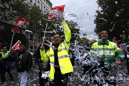 | △ 지난 2013년 스페인 마드리드의 '쓰레기 파업' 때 환경미화원들이 해고에 항의하는 시위행진을 벌이고 있다.(AP=연합뉴스 자료사진) |