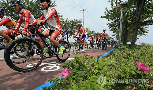 | △ (양양=연합뉴스) 이종건 기자 = 강원도 고성 통일전망대에서 부산 을숙도를 연결하는 총연장 720㎞의 동해안 자전거길 가운데 강원도 구간(고성∼삼척) 242㎞가 개통된 9일 동호인과 사이클 선수들이 페달을 밟고 있다. 2015.5.9 momo@yna.co.kr |