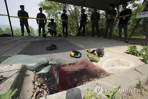 | △ 총기 난사 사건현장 '참혹' (서울=연합뉴스) 임헌정 기자 = 예비군 총기 난사 사건 발생 다음 날인 14일 오후 서울 내곡동 예비군훈련장 내 사고현장인 예비군사격장을 군 관계자가 공개하고 있다. |