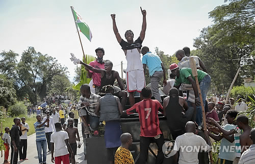 △ 브룬디 시민 봉기 '군부도 동조했어요' (부줌부라 AP=연합뉴스) 피에르 은쿠룬지자 대통령의 3선 출마에 반대하며 3주째 시민 봉기가 이어진 브룬디에서 13일(현지시간) 시민들이 군 트럭 뒤에 올라타고 가며 승리의 신호를 보내고 있다. 이날 수도 부줌부라에는 시위 진압에 나섰던 경찰의 모습이 보이지 않았고, 군인들이 장갑차 위에서 한가롭게 앉아 웃으며 손을 흔드는 모습이 포착됐다. kjw@yna.co.kr