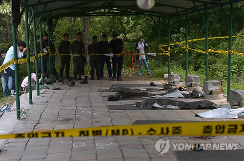 | △ 공개된 총기 난사 사건 현장 (서울=연합뉴스) 임헌정 기자 = 예비군 총기 난사 사건 발생 다음 날인 14일 오후 서울 내곡동 예비군훈련장 내 사고현장인 예비군사격장을 군 관계자가 공개하고 있다. |