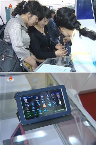 | △ (서울=연합뉴스) 북한이 자체 개발한 태블릿PC '묘향'을 공개했다. 조선중앙TV는 제18차 평양봄철국제상품전람회에서 평제회사가 '묘향'을 새로 출시했다고 보도했다. 전람회 관람객들이 '묘향'을 작동해보고 있다. 2015.5.15 <<조선중앙TV 캡쳐>> |