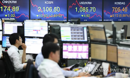 | △ 코스피 약세 코스닥 회복 (서울=연합뉴스) 한종찬 기자 = 코스피가 15일 한국은행의 기준금리 동결 여파로 사흘만에 약세로 돌아서며 2,100선으로 밀려났다. '가짜 백수오 사태' 이후 주춤했던 코스닥은 700선을 회복했다. 이날 코스피는 전날보다 13.83포인트(0.65%) 내린 2,106.50에 장을 마쳤다. 서울 외환시장에서 원.달러 환율은 달러당 4.8원 내린 1,085.7원에 장을 마감했다. 사진은 이날 오후 서울 외환은행 본점 딜링룸. |