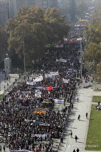 | △ (산티아고 AP=연합뉴스) 14일(현지시간) 칠레 수도 산티아고에서 고등학생과 대학생들이 정부의 교육개혁 약속 이행 지체를 규탄하는 시위를 벌이고 있다. 산티아고를 비롯한 주요 도시에서 올들어 두 번째로 일제히 열린 이날 대규모 집회에서 학생 시위대는 공교육 무상교육을 속히 실시하라고 촉구했다. marshal@yna.co.kr |