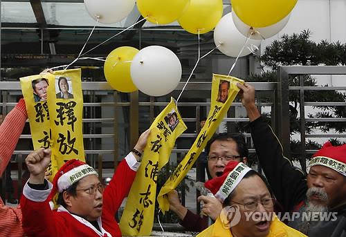 | △ (AP=연합뉴스) 성탄절인 25일 홍콩주재 중국연락판공실 밖에서 산타클로스 복장의 반중 시위자들이 노벨평화상 수상자인 류샤오보(劉曉波), 변호사 푸즈창(浦志强) 등 투옥된 중국 인권운동가들의 사진을 단 풍선을 들고 이들의 석방을 요구하며 농성을 벌이고 있다. |