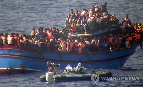 △ (AP/이탈리아 해군=연합뉴스) 이탈리아 해군 보트가 2014년 6월29일(현지시간) 시칠리아섬과 북아프리카 해안 사이의 지중해 한복판에 멈춰선 어선으로 다가가고 있다. 이 어선에는 난민 600여명이 발디딜틈 없이 타고 있었으며 질식사한 것으로 보이는 시신 30여구가 발견됐다.