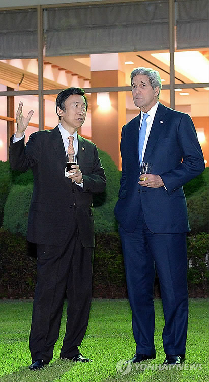 | △ 외교장관, 존 케리 미 국무장관과 만찬 (서울=연합뉴스) 윤병세 외교장관이 17일 오후 한국을 방문한 존 케리 미국 국무장관과의 비공개 만찬장에서 대화를 하고 있다. 2015.5.17 << 외교부 제공 >> photo@yna.co.kr |