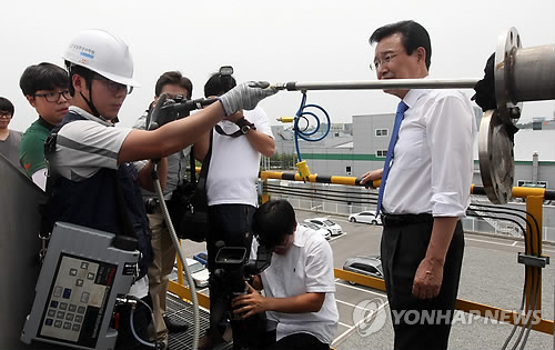 △ (청주=연합뉴스) 김형우 기자 = 청주 오창화학산업단지의 악취가 여전하다. 충북도는 매년 악취 발생원인 규명에 나서지만 마땅한 해결책이 없어 골치를 앓고 있다. 사진은 지난해 7월 오창산단의 발암가능물질인 디클로로메탄 배출농도를 측정하는 국립환경과학원 관계자. <<연합뉴스DB>>