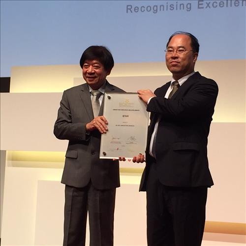 | △ SK건설은 18일 싱가포르 건설청이 주관하는 ‘2015 친환경 건설사 인증’(GGBA, Green and Gracious Builder Award)에서 최고 등급인 스타(Star) 등급을 수상했다고 밝혔다. 김용민(오른쪽) SK건설 현장소장(도심지하철 3단계 930공구)이 콰분완 싱가포르 국가개발부 장관과 인증서를 들고 기념촬영을 하고있다. SK건설 제공 |