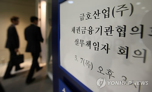 | △ 지난 7일 서울 여의도 KDB산업은행 본관에서 열린 금호산업 채권금융기관 협의회 실무책임자 회의에서 참석자들이 대기실로 이동하고 있다. (연합뉴스 자료사진) |