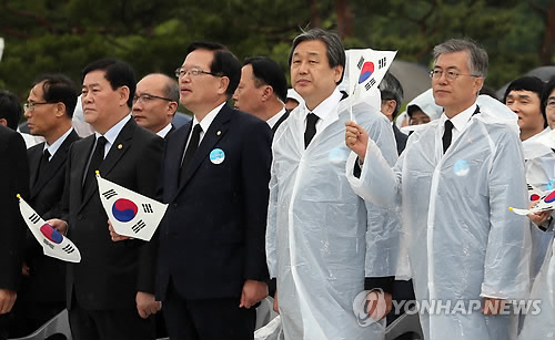 새누리당 김무성·새정치민주연합 문재인 대표는 18일 오전 광주 북구 운정동 국립 5·18민주묘지에서 열린 5·18 기념식에 참석해 맨 앞줄에 나란히 앉았다.
