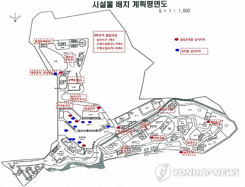 | △ 불법 시설물 난무하는 삼정 더파크 (부산=연합뉴스) 김선호 기자 = 부산 동물원 '삼정 더파크'의 불법시설 설치와 무단벌목 등에 '모르쇠'로 일관하던 부산시가 최근 검찰의 관련 수사가 본격화하자 부랴부랴 동물원 측을 경찰에 고발했다. 사진은 부산시 산하 부산시설공단이 동물원 내에서 적발한 불법시설물 현황도. 빨간 점선과 빨간 점은 건축물을 허가없이 증축하거나 불법으로 세운 곳이며 파란색 점은 불법으로 놀이시설이나 공작물 등을 설치한 곳이다. 총 92개소가 적발됐는데 사실상 동물원 전반에 걸쳐 있다. 2015.5.18 wink@yna.co.kr |