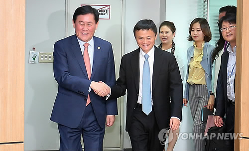 | △ 입장하는 최경환-마윈 (서울=연합뉴스) 한종찬 기자 = 최경환 부총리 겸 기획재정부 장관(왼쪽)이 18일 서울 양재동 aT센터에서 'T-mall내 한국관 개통식'에 참석차 방한한 마윈 알리바바 회장과 함께 회의실로 향하고 있다. 2015.5.18 saba@yna.co.kr |