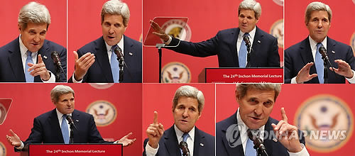 | △ 존 케리 미국 국무장관의 다양한 제스처 (서울=연합뉴스) 임헌정 기자 = 존 케리 미국 국무장관이 18일 오후 서울 안암동 고려대학교 인촌기념관에서 '사이버안보'를 주제로 특별강연을 하며 다양한 제스처를 취하고 있다. 2015.5.18 kane@yna.co.kr |