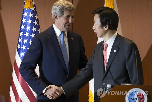 | △ 한·미 외교장관 악수 (서울=연합뉴스) 전수영 기자 = 윤병세 외교부 장관과 존 케리 미국 국무장관이 18일 오후 서울 외교부 청사에서 공동 기자회견을 마친뒤 악수하고 있다. |
